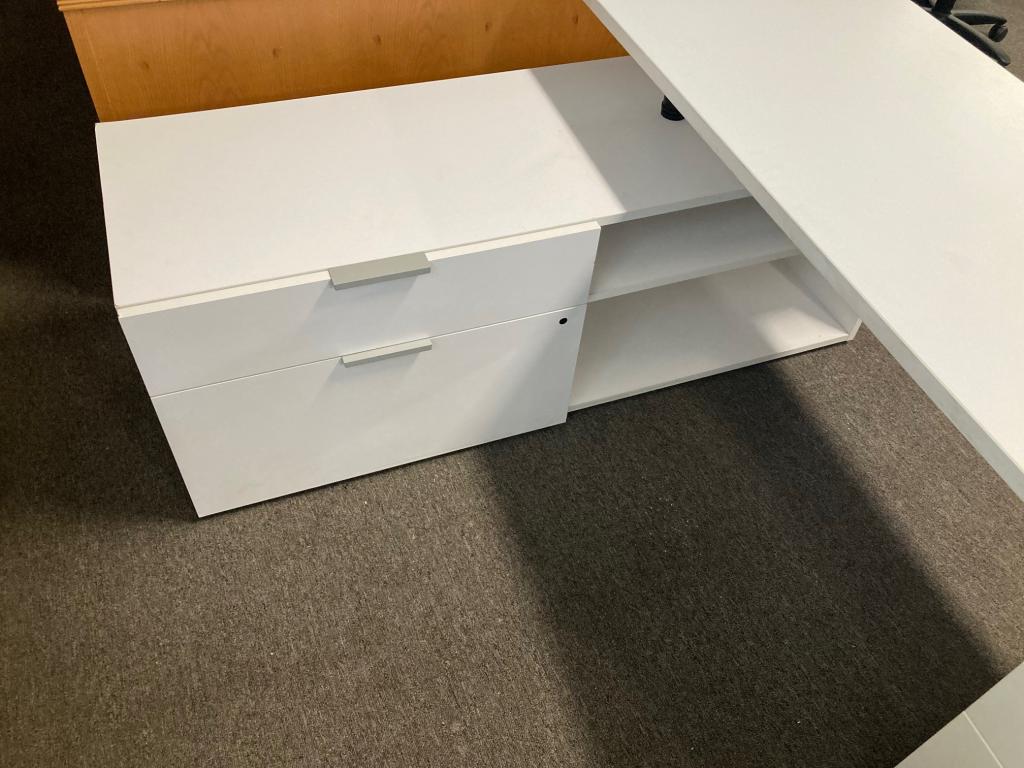 Description Set of 10-6x5 L desk. Includes 1-24x72 surface, 1-5' wide cabinet with drawers and shelves and 1-mobile pedestal with cushion