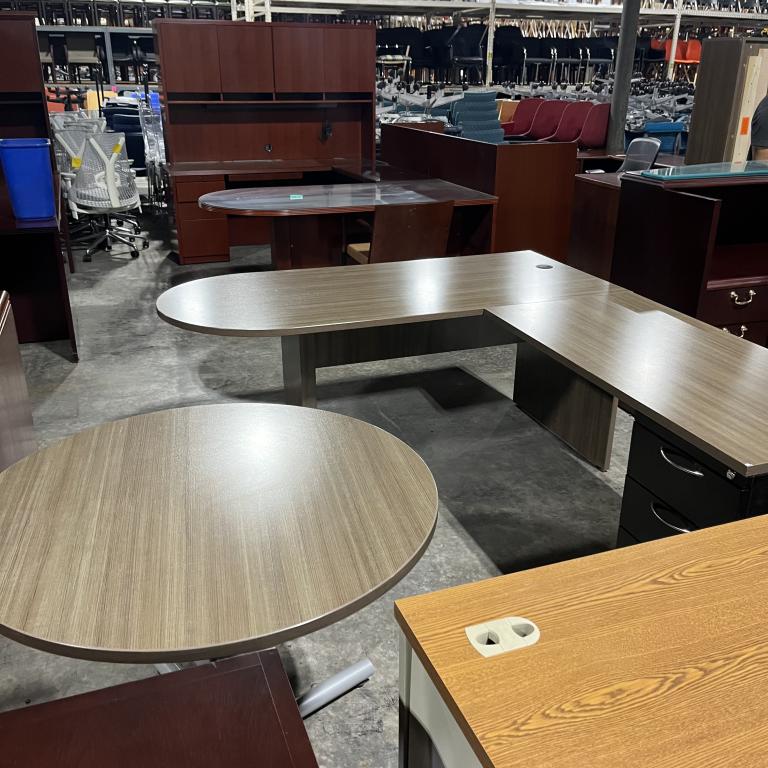 Description Now Available, Indiana L Shaped Desk with a beautiful Virginia Walnut finish, these desks are a great way to add a modern touch to any office space. This desk is included with a pedestal. *WHS*