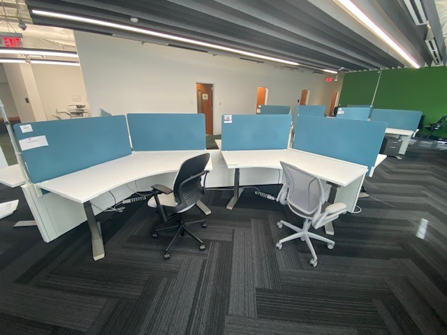 Description Steelcase dog-bone / 120-degree cubicles, dividers, and powered walls are available. (Dog Bone - 120 Degree) Electric table bases included. Pedestals $50 each