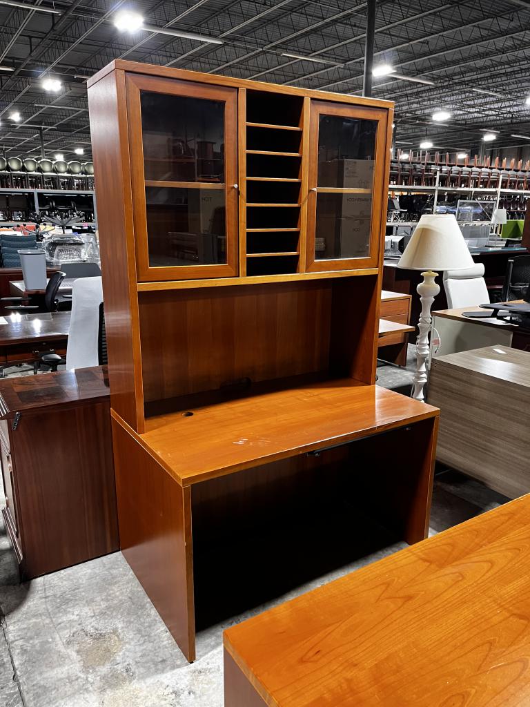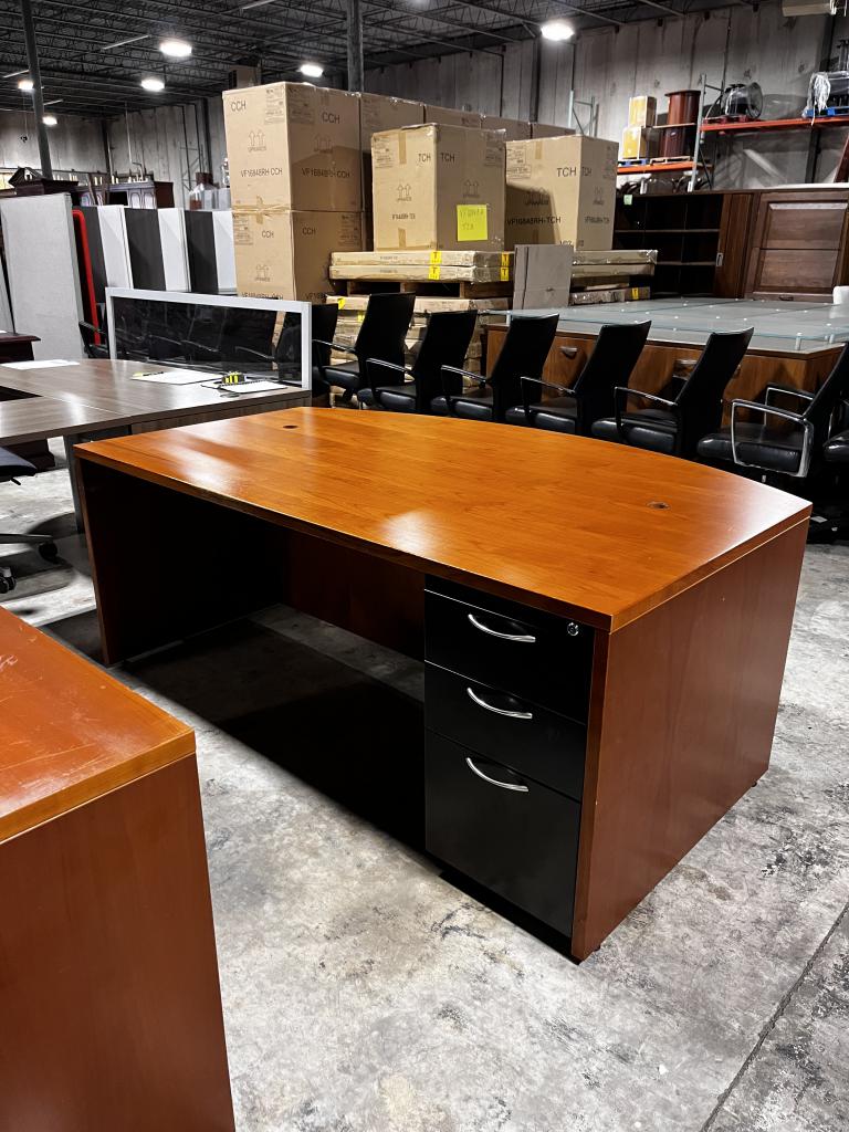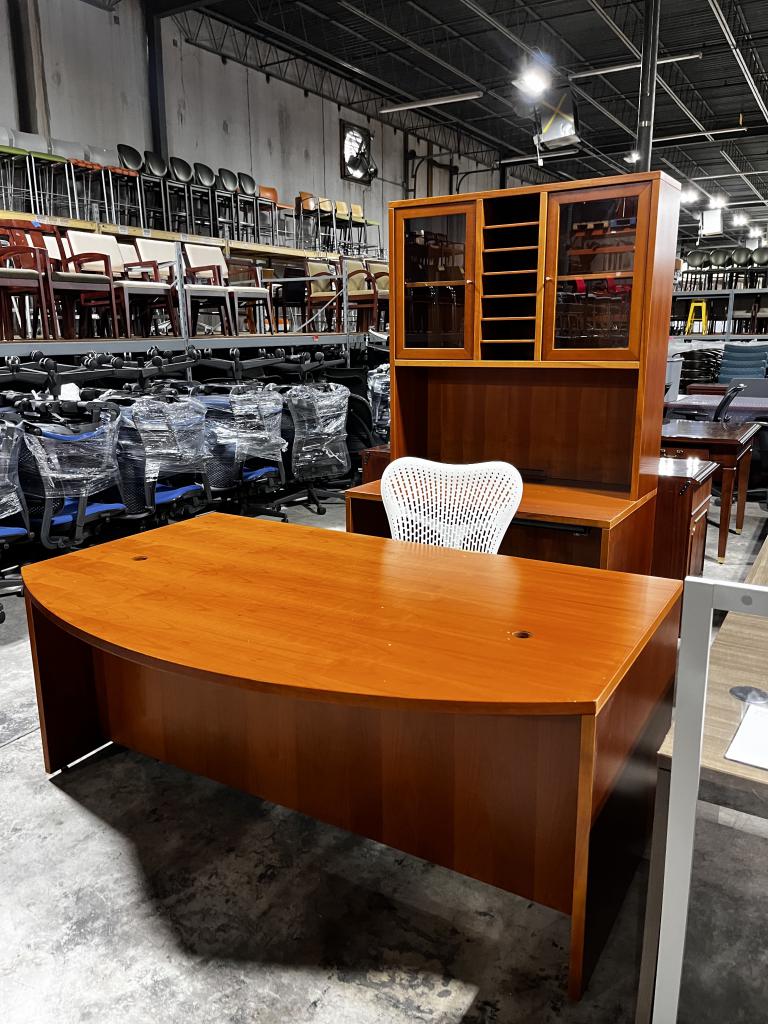 Description Now Available, Bowfront single-pedestal desk designed with a rich cherry wood finish. This set comes with a credenza featuring a hutch, all finished in the same style. Upgrade your office space with this stunning piece today!