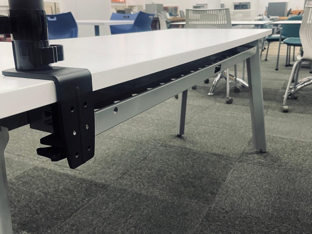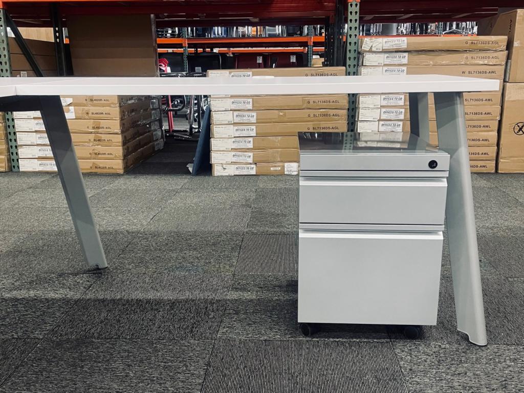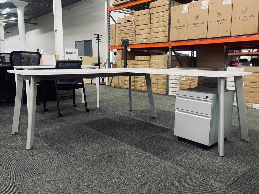 Description New Flex L Shape Desk includes, (1) 72" W x 24" D Desk work surface / (1) 48" W x 24" D Return / Single Starter Unit 72" W x 24" D / (1) Mobile Silver Box/File Pedestal / (1) Silver End Panel Leg. Monitor Arm Sold Separately, $99 Retail price. New to order direct from manufacturer. Not in-stock please allow 2-4 weeks for delivery.