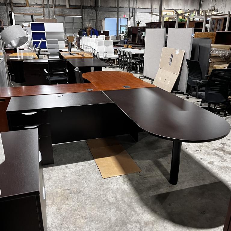 Description Now Available, L-shaped desk designed with a rich mahogany finish. Among the five desks available, two are sit-stand desks. These units feature a motorized mechanism, allowing you to raise or lower the desk to achieve your preferred working height. Explore the perfect blend of style and functionality for your workspace.
