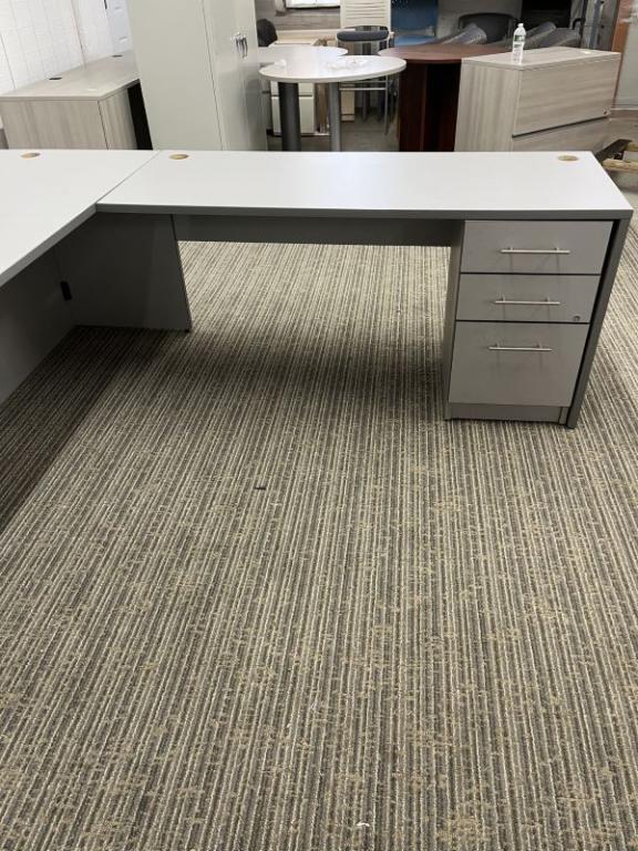 Description Desk shell with right-hand return and box/box/file pedestal (locking)- Gray laminate. Grommet cutouts on desk & return. Dimensions: Desk: 72" Wide x 30" Deep x 29" Height Return: 60" Wide x 24" Deep x 29" Height