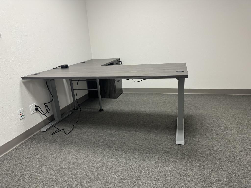 Description We have these OFS Slate Grey 6’x6’ Height Adjustable Tables that have a 72”x30” desk top and a 48”x24” return with a fixed pedestal and post leg.