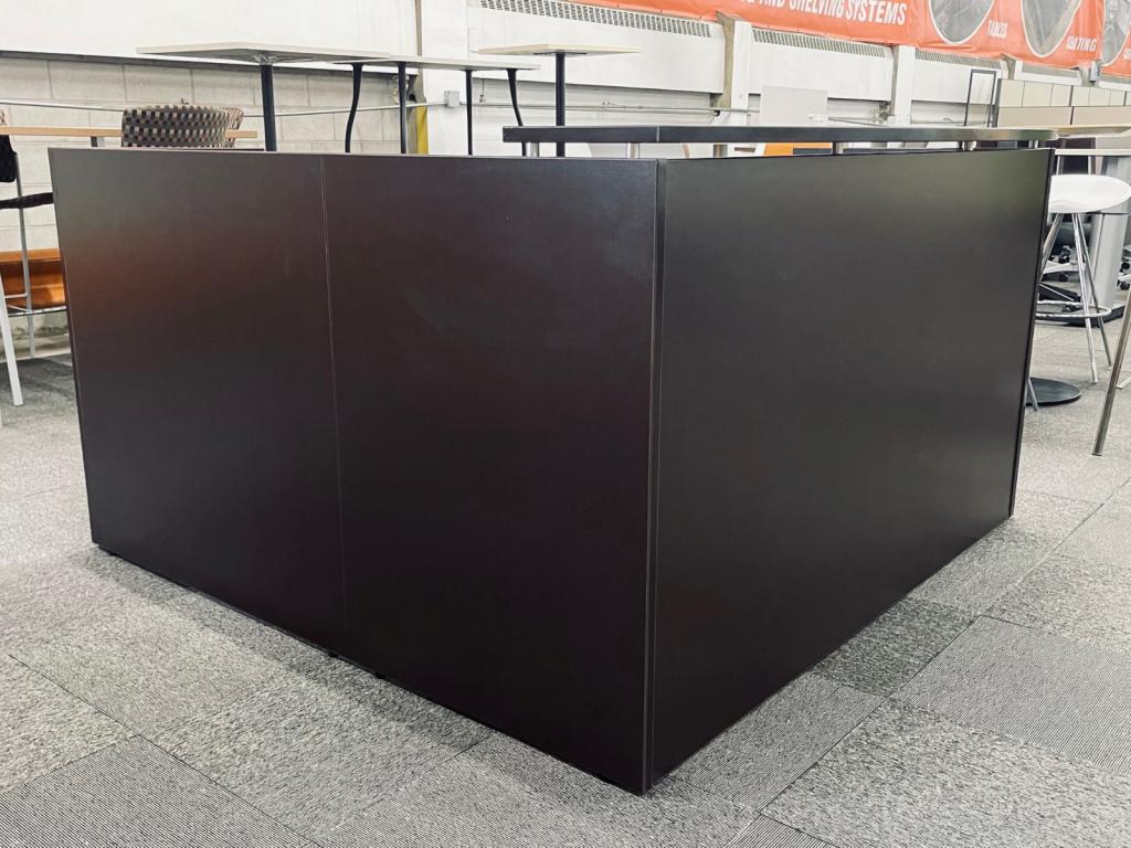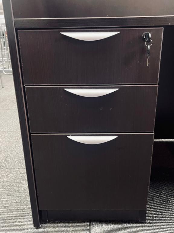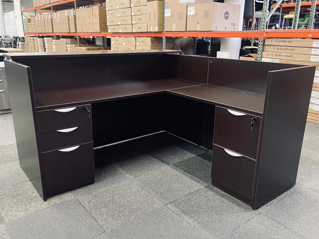 Description NEW Offices To Go L-Shape Reception Desk In American Espresso Finish Has A 71"W x 30"D x 41"H Desk With (1) BBF Pedestal & Transaction Top. (1) 42"W x 24'D x 41"H Reversible Return With (1) FF Pedestal. FF pedestal available to substitute for same price. Limited quantity available in-stock but larger quantities can be ordered.