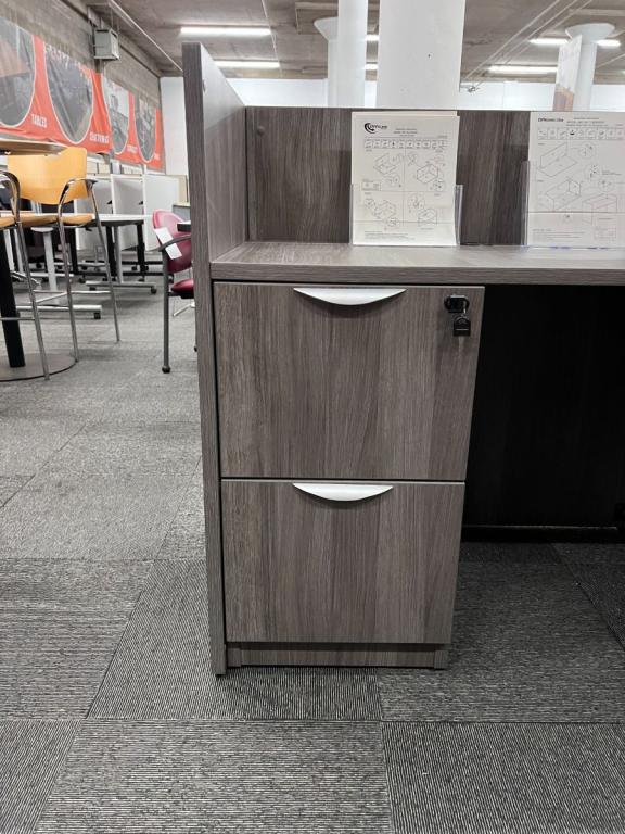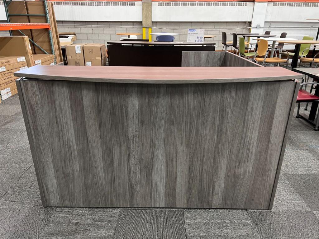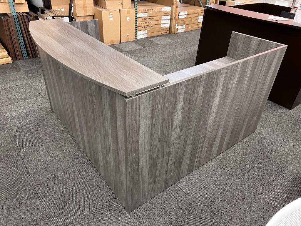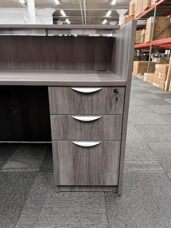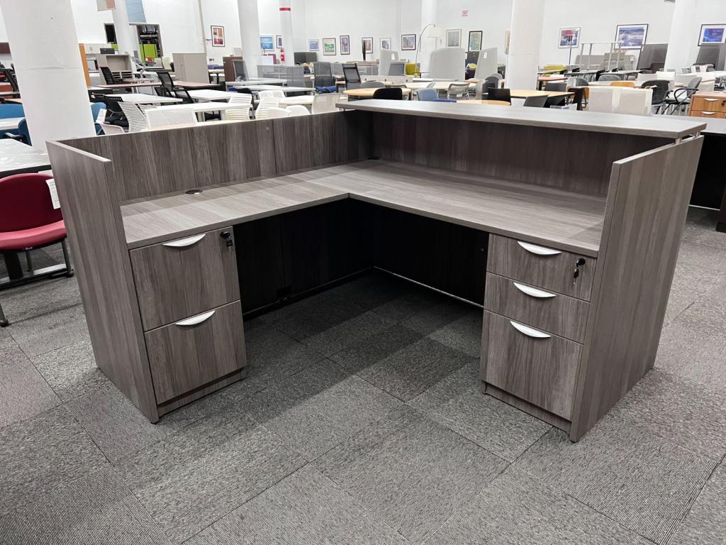 Description NEW Offices To Go L-Shape Reception Desk In Artisan Grey Finish Has A 71"W x 30"D x 41"H Desk With (1) BBF Pedestal & Transaction Top. (1) 42"W x 24'D x 41"H Reversible Return With (1) FF Pedestal. FF pedestal available to substitute for same price. Limited quantity available in-stock but larger quantities can be ordered.
