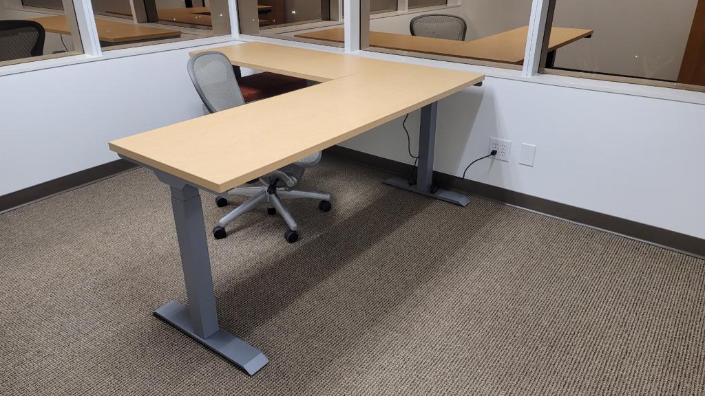 Description We have this Herman Miller 6’x6’ L shape Maple desk top that is 24” deep. The tops are pre owned Herman Miller and the base is height adjustable new in box HAT with memory set. Mobile pedestal based on stock at $99 each additional.