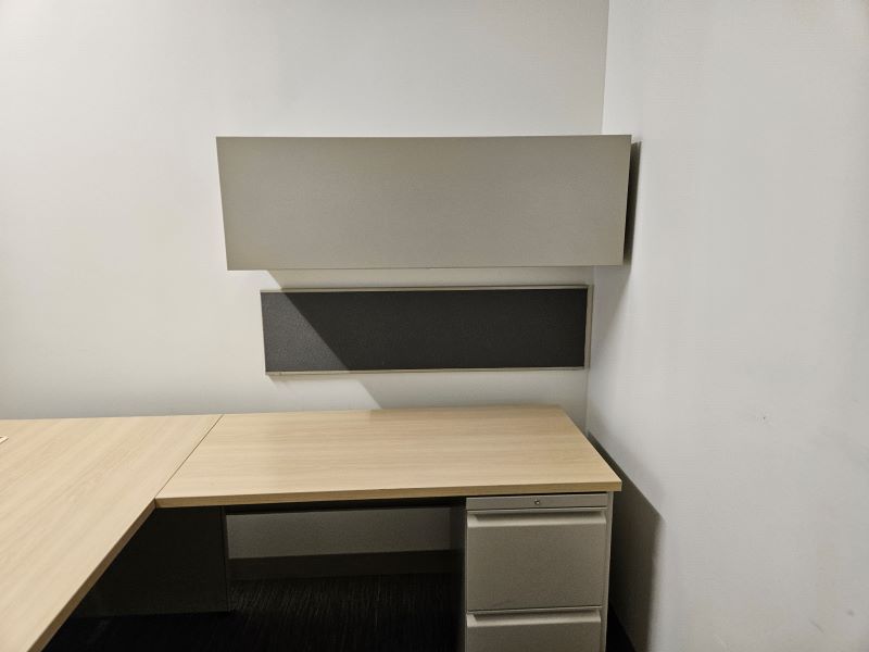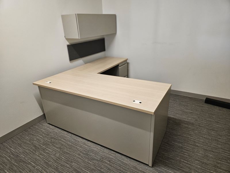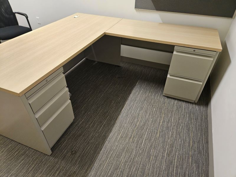 Description Light Oak laminate L-shaped Right handed desks with (1) box/box/file pedestal and (1) file/file pedestal. Includes (1) 48" tackboard and (1) 48" overhead bin. Trim color is grey. Dimensions: 72" W x 30" D 48" W x 24" D