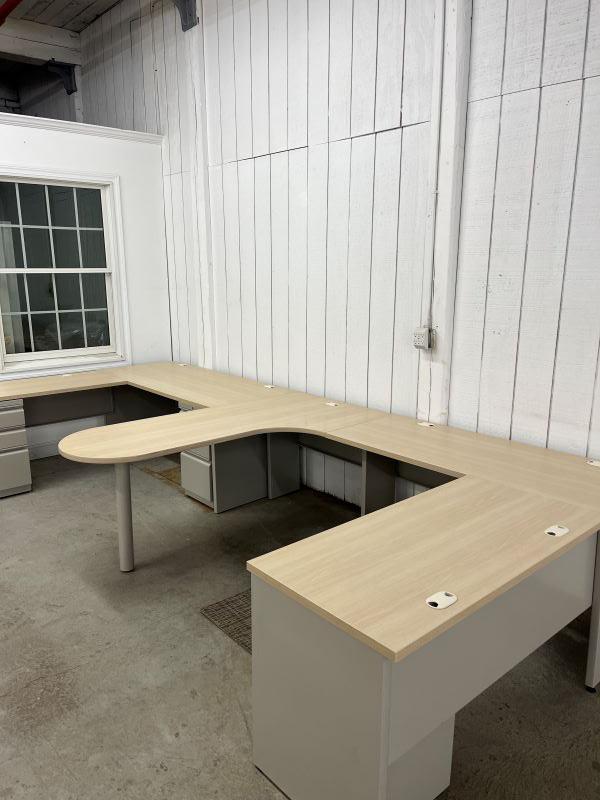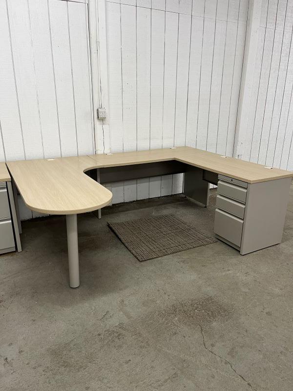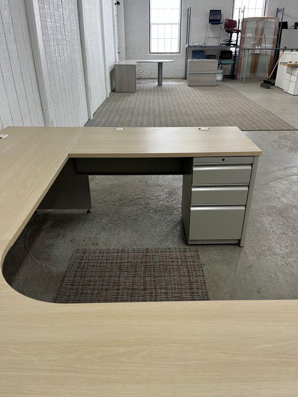 Description U-shaped peninsula desk featuring Light Oak laminate worksurfaces, (2) 48" overhead bins, (2) 48" tackboards, and (1) box/file/file pedestal. Trim color is grey.