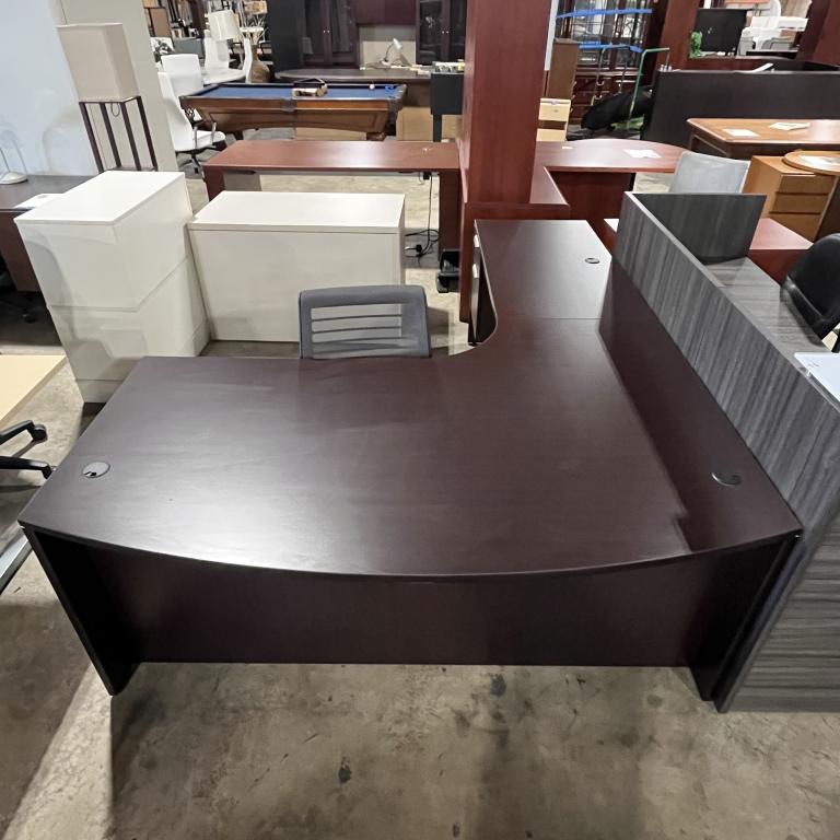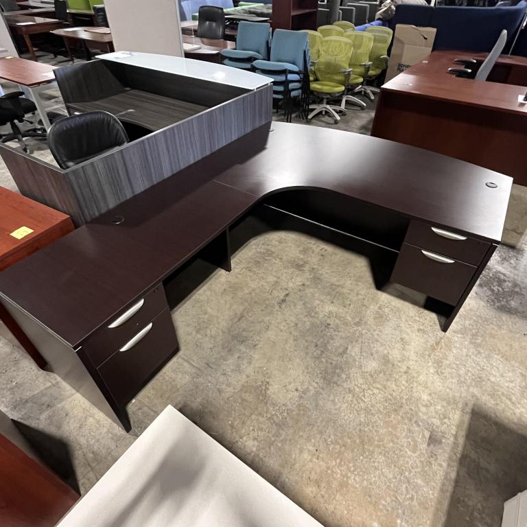 Description Elevate your workspace with this sleek pre-owned Contemporary L-Shaped Desk, featuring a rich espresso laminate finish. Equipped with two pedestals, it's crafted to enhance productivity and is in excellent condition. *WHS*