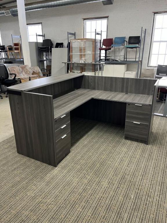 Features (1) box/box/file locking pedestal and (1) file/file locking pedestal, bow-shaped transaction counter, and raised privacy panel. Grommet access on desk & return.