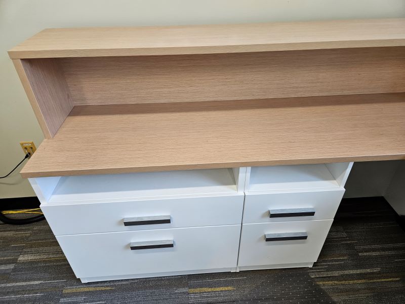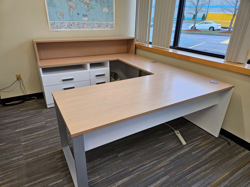Description Maple laminate U-shaped office desk with left-handed return station. Features a stack on shelf, an open shelf/box/file pedestal, and (2) open shelf/box/file lateral file.