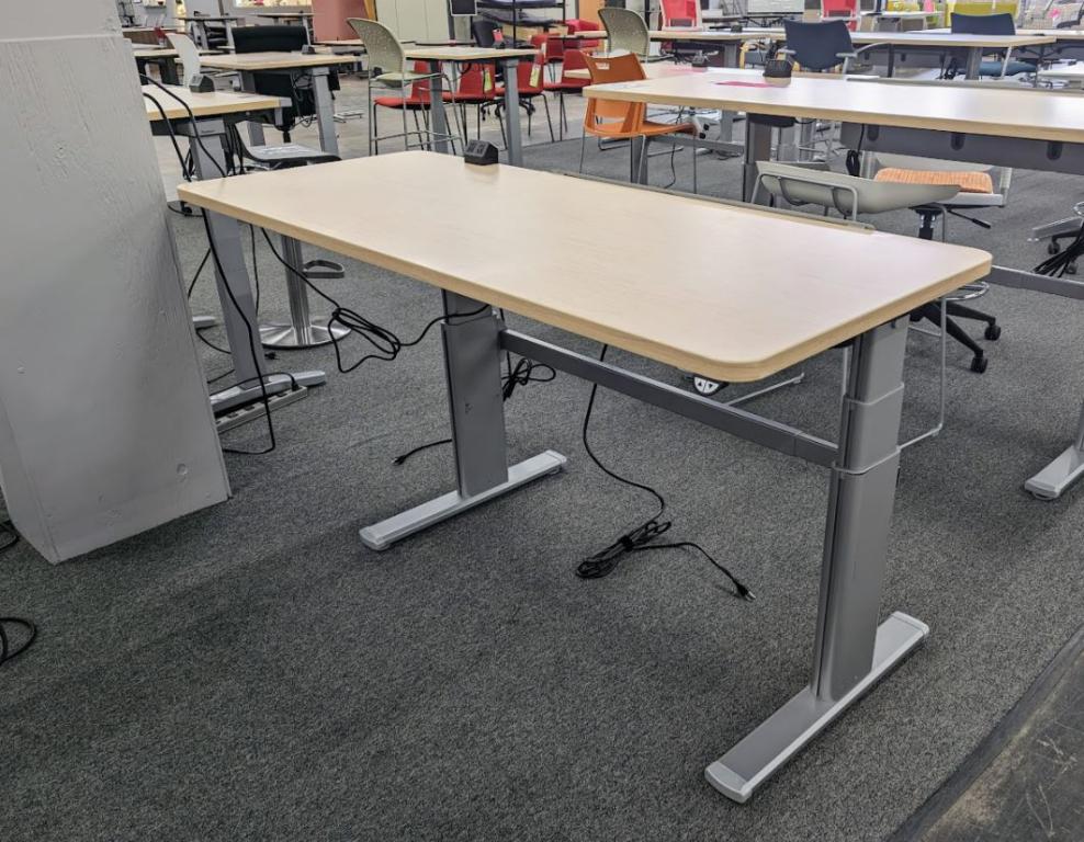 Description Get up & get moving with our Steelcase electric sit-stand desks. They have a light maple laminate top with a platinum base, measuring 70" x 29"W. Each unit comes with a desk mount power box. With the option for the units to come with a dark gray up-mount privacy screen.
