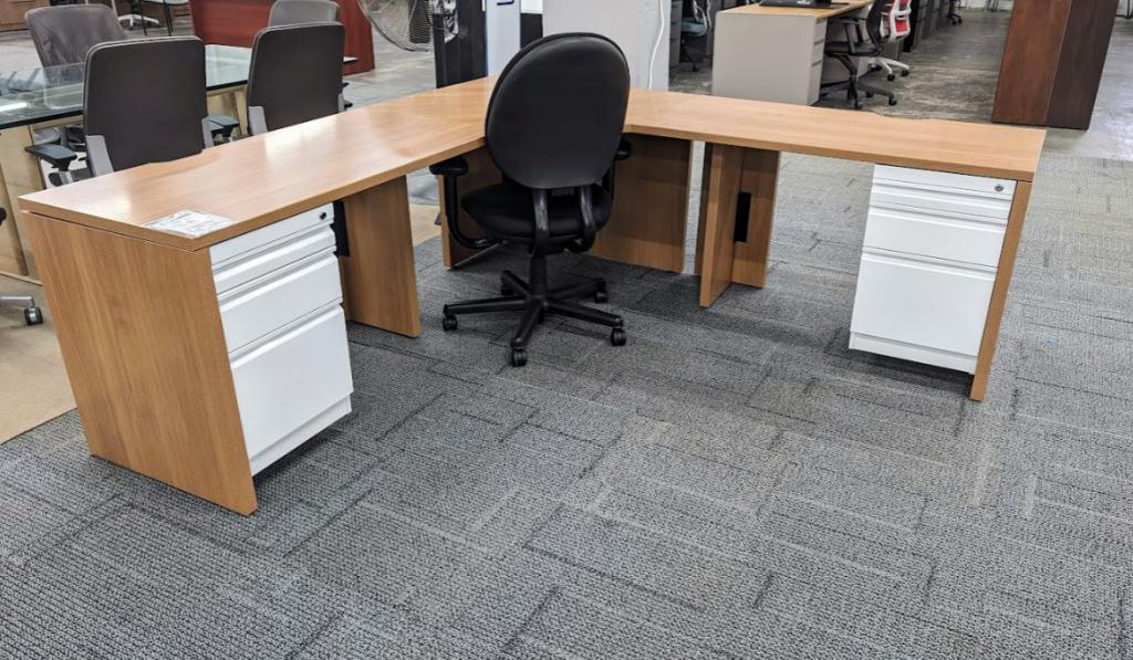 Description Save on space with our laminate corner desks in a oak finish. Each desk will come with a pair of white metal pencil Box / Box / File drawer storage - no key. Offered with & without upper bookcase storage, that measures 40"H x 36"W x 19"D.