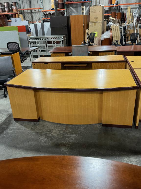 Description Upgrade your office with our grand bow front desk and matching credenza with a maple veneer finish and mahogany trim. Stay organized with 2 pedestals and a two drawer lateral file. Elevate your office style today! *WHS_0524*