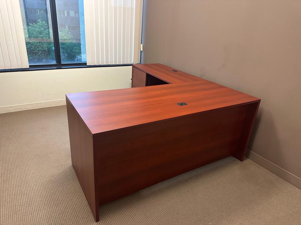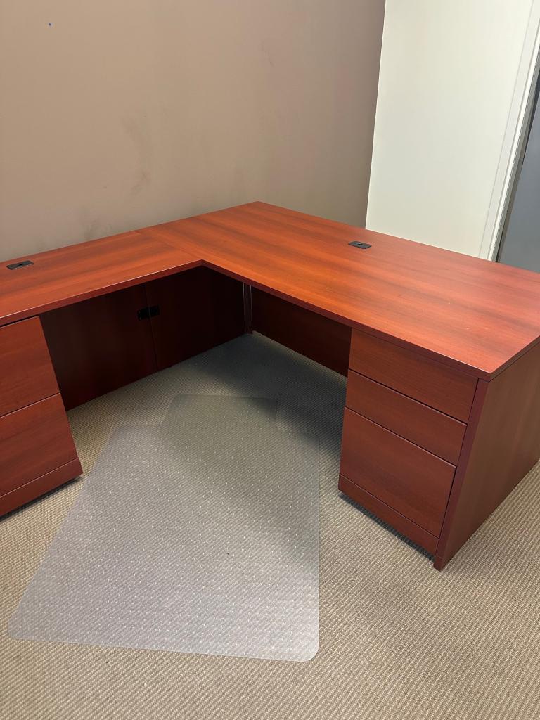 Description L Shape Desk by Global in Mahogany Laminate Finish Desk: 66" x 30" x 29" H Return Is : 42" L x 20" D Left and Right Hand Available 10 Like This Available used Desks, w/ normal wear & tear, overall in good working condition