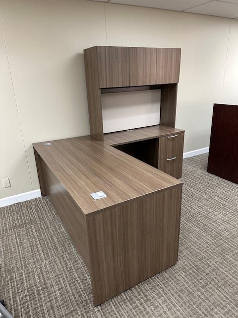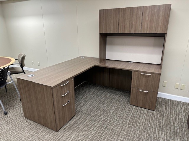 Description Paoli L-Shaped Desk w/Hutch, Task Board, Light, F/F and B/B/F in brown/gray tone finish. Excellent condition!