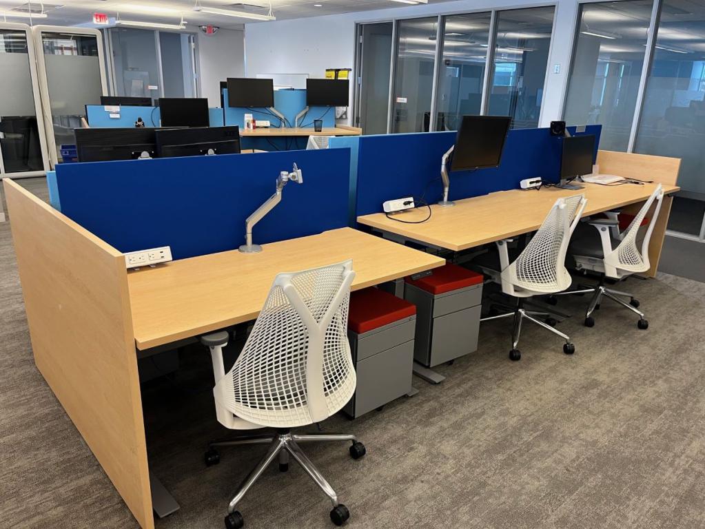 Description (106) 28x58 Enwork Sit & Stands: These immaculate tables come in finished wood pods of 6 & 8, with a powered trough (see pics). The pods have the flexibility to make your own floor plan. Each table comes with surface power/data modules, mobile b/f ped & privacy screens. The height capabilities is 27"- 47"H