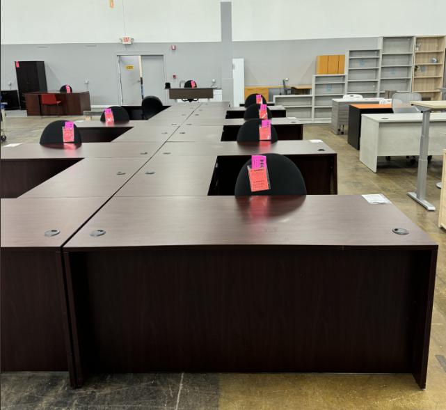 Description Laminate Single Ped L Desks in Mahogany finish.