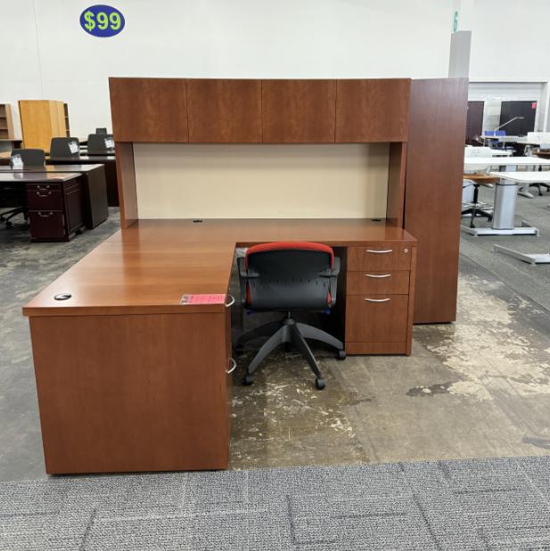 Description Steelcase wood L desks with a hutch in Cherry finish. An add on matching 5 shelf 30"W bookcase is available as well for $229.00 **PRICE OF DESK WILL REMAIN THE SAME WITH OR WITHOUT A HUTCH**
