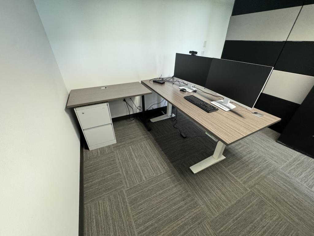 Description We have these 6’x6’ Haworth white height adjustable table bases that are in excellent condition with new driftwood tops and a pre owned pedestal. Pedestal based on stock, white, back and silver available.