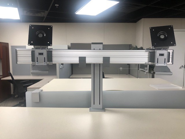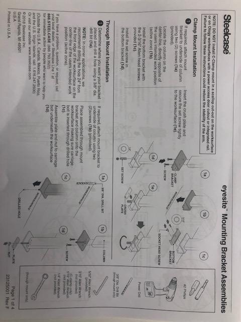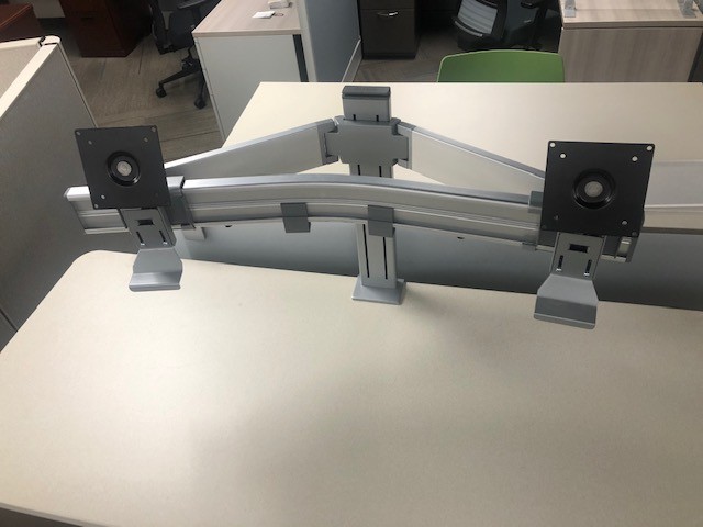 Description Steelcase Details Eyesite Dual Monitor Arms with a clamp mount system. Accommodates one or two monitors and lets you position each in the optimal position. This award winning Monitor Support features height adjustability that ensures both screens are always perfectly in line. 35" w x 8.5" d. Supports two monitors up to 24" and 25 lbs (each)