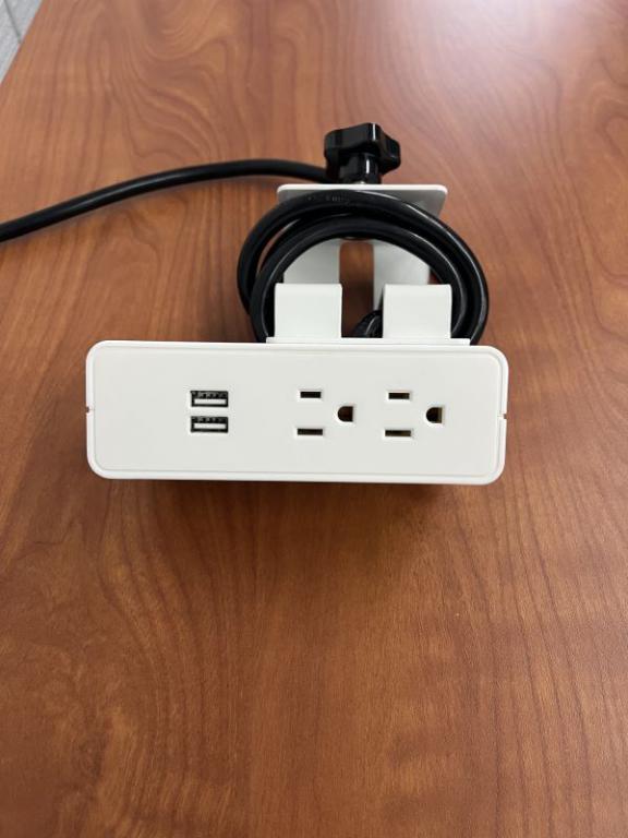 Description Fits on up to 1 3/16" thick work surface edge 14 gauge molded plug wire (black) 2x 15 amp duplex outlets 2x USB Ports White Finish