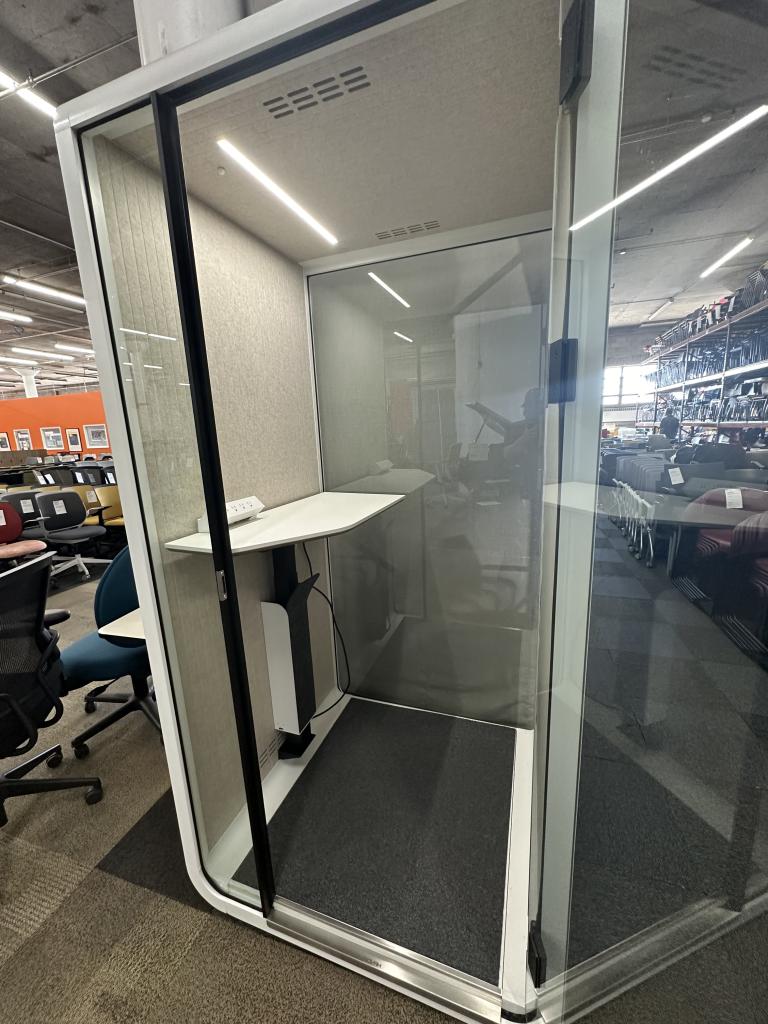 Description Pre-owned NOVA Phonebooth. Features: Table with (1) power grommet with (3) Duplexes / (1) USB C Port / Light / Fan. Dimensions: 43 1/4" W x 39 1/4" D x 86 1/2" H.
