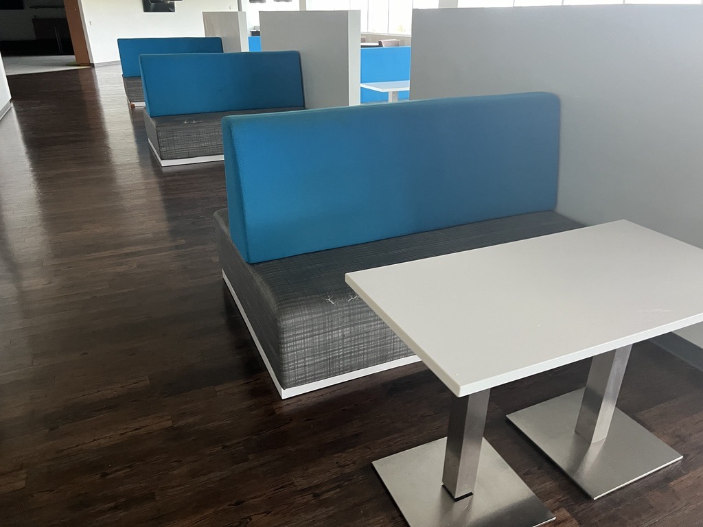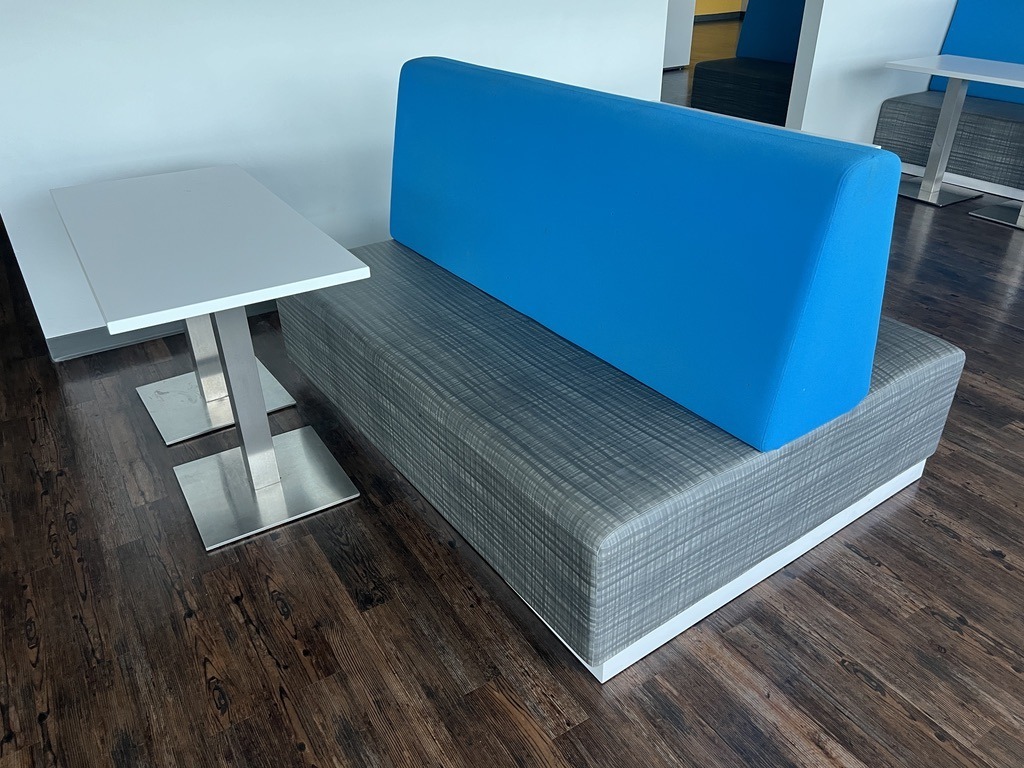 Description Add cozy charm and versatile seating to your space with this double-sided booth! Featuring fully upholstered shared backrests in a rich blue fabric with a subtle grey flannel-like pattern cushion seat, this booth blends comfort with style. Perfect for cafes, lounges, or any area needing a touch of modern sophistication.*WHS_1124*