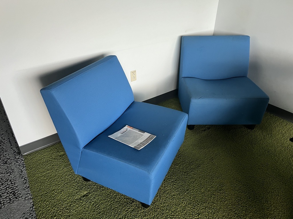 Description Brighten up your space with these vibrant armless lounge chairs in cobalt blue, green, or orange! With a sleek, modern, and low-profile design, they’re perfect for adding a bold pop of color to your office, living room, or reading nook. Gently used, these chairs offer sturdy construction and cushy comfort. *WHS_1124*