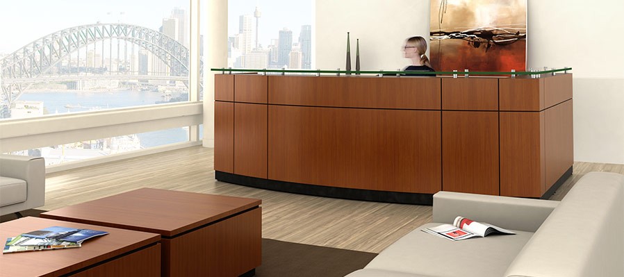Description Create a striking first impression with the Willow Reception Series, which features an elegant bowfront design with laminate or wood veneer, a glass transaction top, and a three inch overhang on satin chrome stand-offs. It includes black reveal accents, with toekicks and pedestal pulls in black or satin finish.