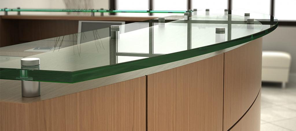 Description Create a striking first impression with this new custom reception desk. It features an elegant bowfront design with laminate or wood veneer, a glass transaction top, and a three inch overhang on satin chrome stand-offs. It includes black reveal accents, with toekicks and pedestal pulls in black or satin finish. An elegant solution to your reception needs while still being affordable.
