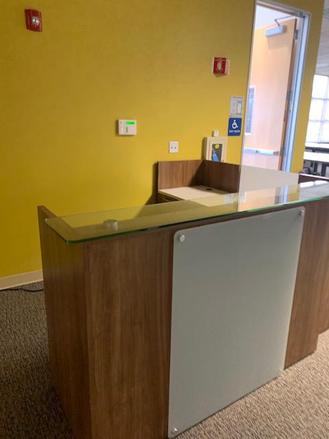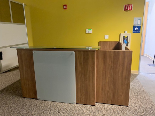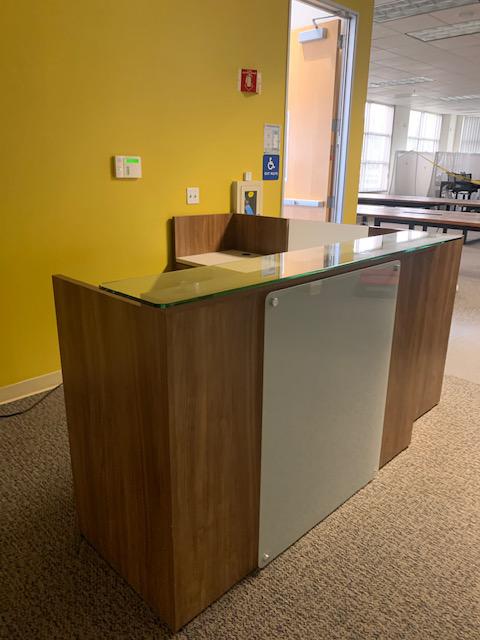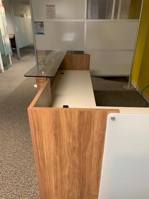 Description Trans. counter Glass. Light Tan Laminate. Opaque plastic front square. Table tops off white (24"d)