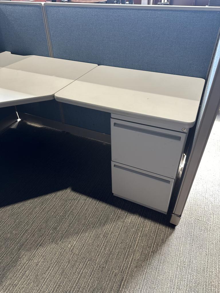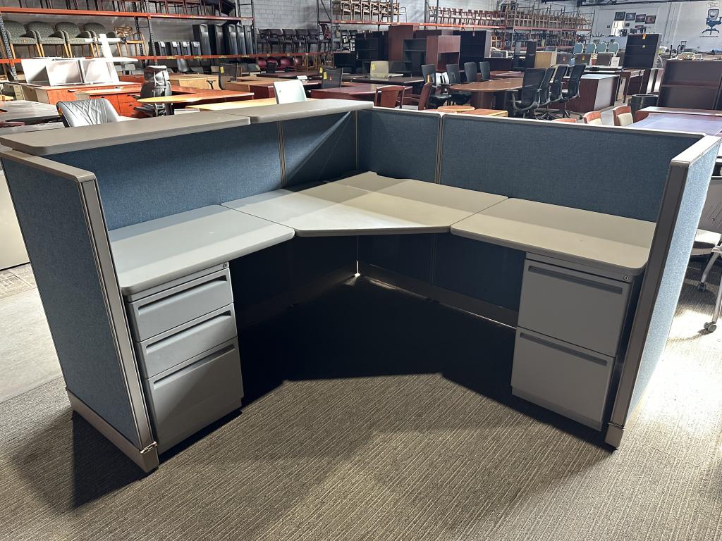 Description Reception Cubicle Station by Haworth Unigroup 6' x 83" x 46" H in Front Please Check All Pictures For All DR Comes w/ Two Pedestals , One on Each Side Used Desk, Comes w normal wear and tear in overall good working condition