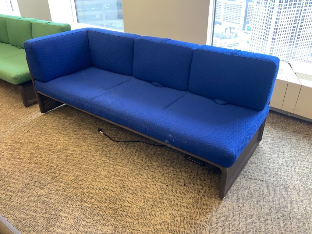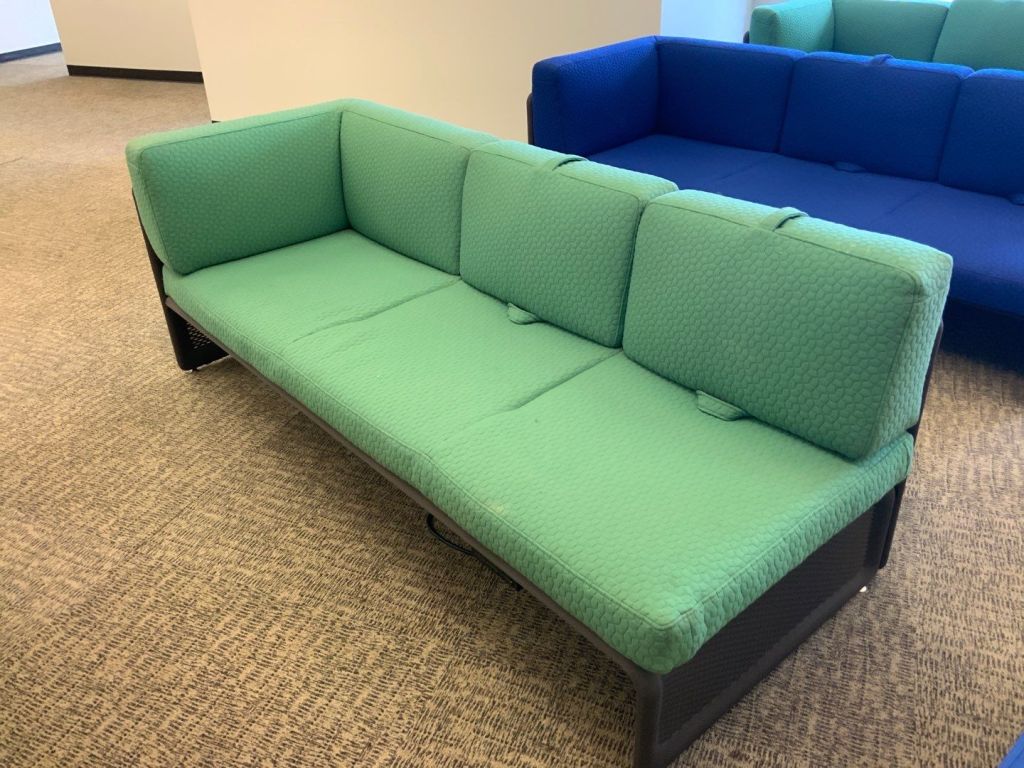 Description Now available vibrant Steelcase couch sets! Choose from a variety of colors to elevate your office space. Each set includes a couch and matching chair. Blue- 3 Green- 2
