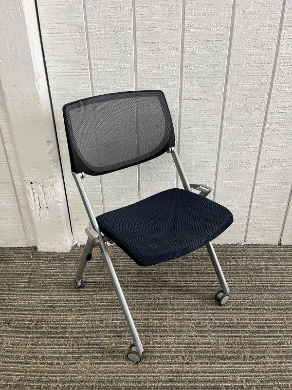 Description Allsteel Seek armless nesting chair. Navy cushion, black mesh back, silver frame. Dimensions: Seat is 18" wide x 19" deep x 18.5" tall (seat height).