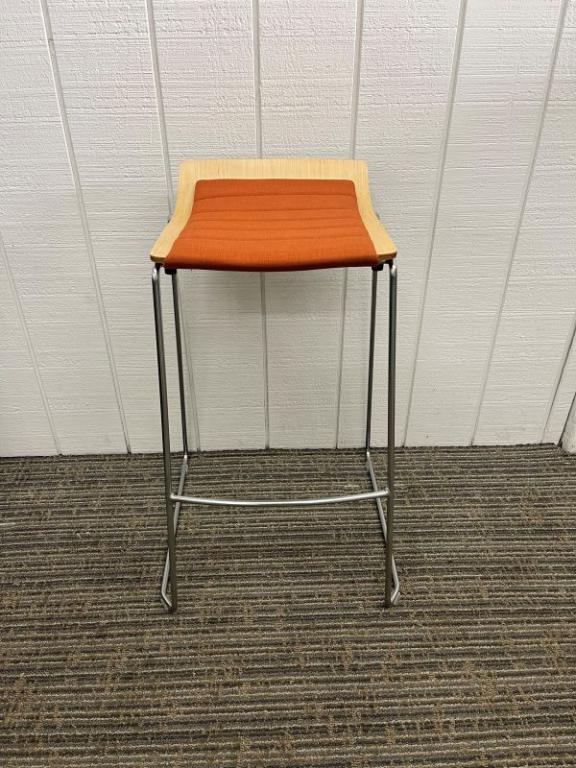 Description Hon armless stacking bar stool, maple laminate seat with orange fabric seat cushion, chrome legs. Dimensions: 15.5" W x 17.5" D, seat height 31".