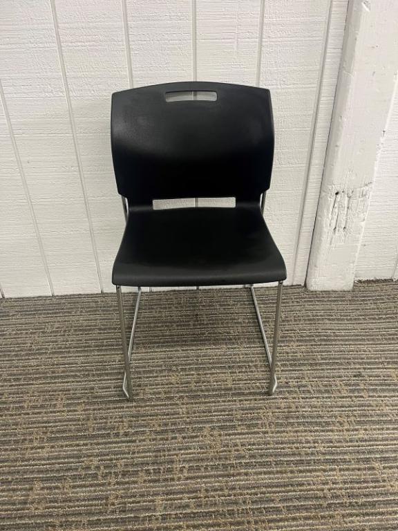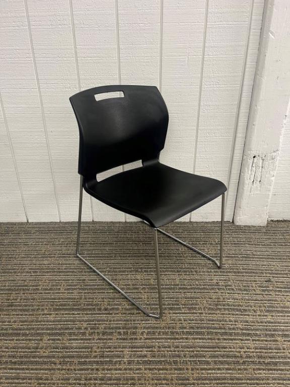 Description Global "Popcorn" polypropylene armless stacking chairs with a chrome sled base and "Night" black plastic seat and back Dimensions: 18" wide x 20" Deep; 16" seat height, 36" overall height