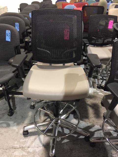 Description We have several Sit On It Task Stools they have top grain leather seats with Black Mesh Backs and foot ring. They adjust down to a normal sitting height and then go up to cafe height. Great for any sit/stand desk you could think of.