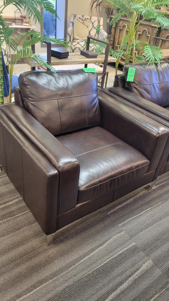 Description Brown Leather Armchair (Showroom). Double armed leather armchair with silver base. Has a corresponding sofa. Stylish and comfortable addition to your office or living area.