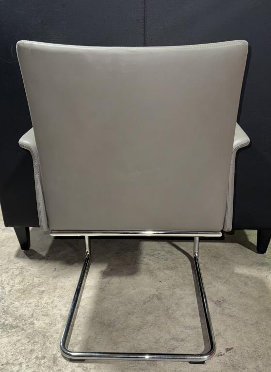 Description This Davis Furniture guest chair blends modern sophistication with practical comfort. Upholstered in gray leather, it features a minimalist design with clean lines and a gently curved backrest that offers excellent support. The chair's arms are subtly padded for added comfort, and the polished chrome sled base adds a touch of elegance while ensuring stability. Perfect for contemporary office settings or stylish reception areas, this chair makes a refined statement while keeping guests comfortable.