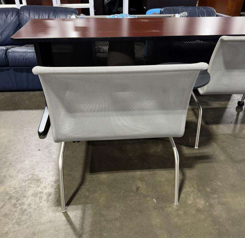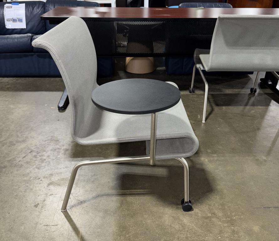Description Keilhauer Sling Chair is a stylish, slightly oversized chair combines breathable grey mesh upholstery with a polished chrome frame for a sleek, professional look. Designed with front casters for easy mobility, it offers both comfort and flexibility. The rotating black tablet arm brings a practical touch, making it perfect for multitasking in any workspace. *WHS_1124*