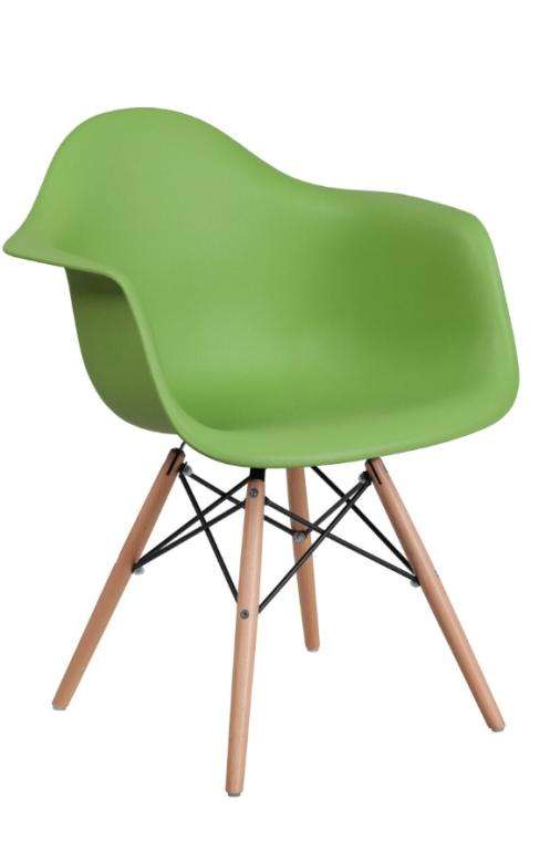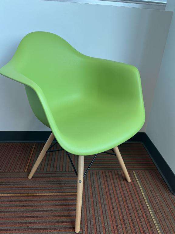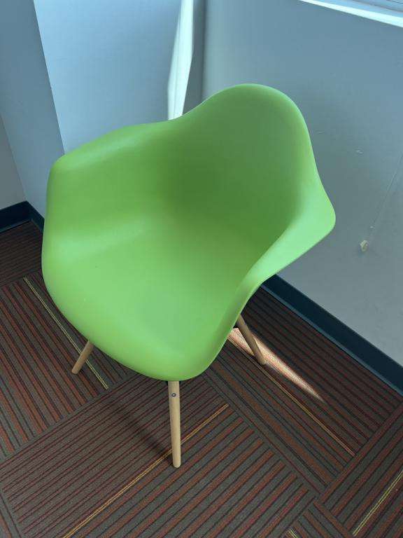 Description This plastic chair provides both style and comfort, conforming perfectly to your body for a cozy seating experience. With a vibrant green molded plastic structure, it’s visually striking and set on an intricate metal base with oak wood legs, adding a warm touch of natural elegance. Mimicking the iconic molded Eames chair, this piece brings timeless, modern design to any space. *WHS_1124*
