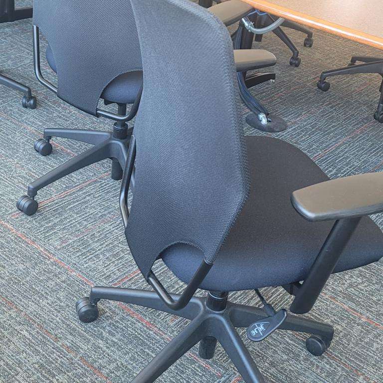 Description Harter chairs used for Conference Seating only. Excellent condition. 1/2 of the chairs have patterned seat pans. The other 1/2 are all black.