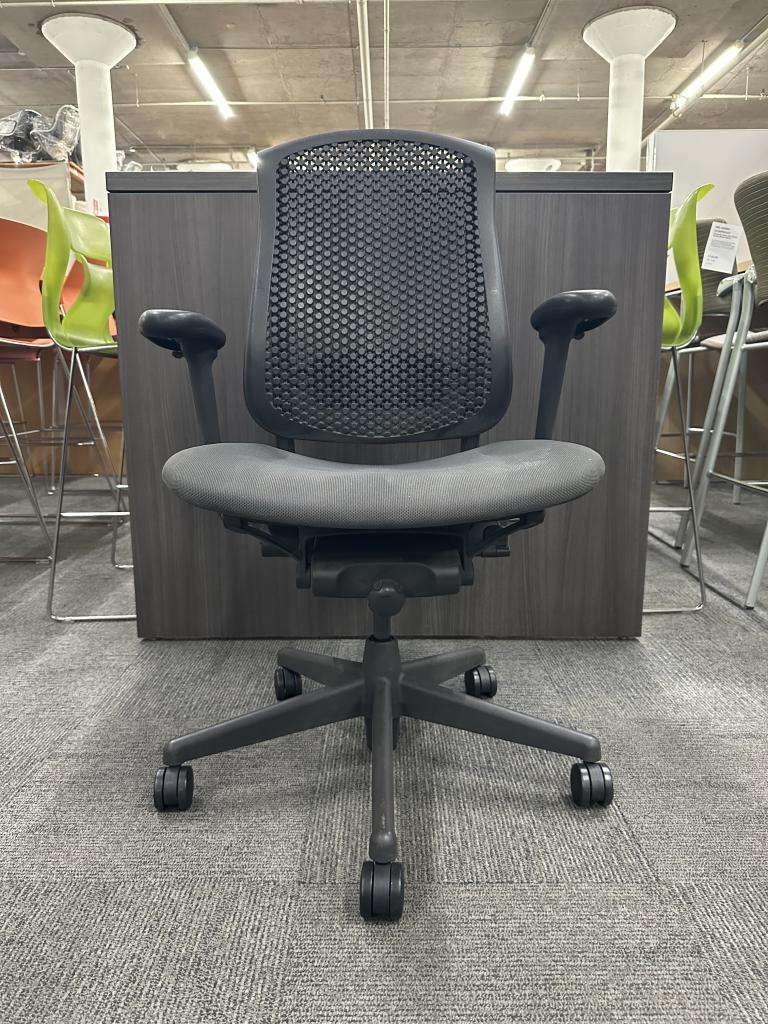 Description Pre-owned Herman Miller Celle Task Chair with a Black foam foam like seat in a black finish color. Note: Minor wear and tear on the seat, price reflects these defects. Features: Pneumatic Height Adjustable Seat / Cellular Suspension Back / Cellular Suspension Seat / Adjustable Arms / Adjustable Lumbar Support / Tilt Lock / Adjustable Tilt Tension.