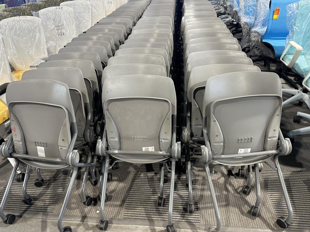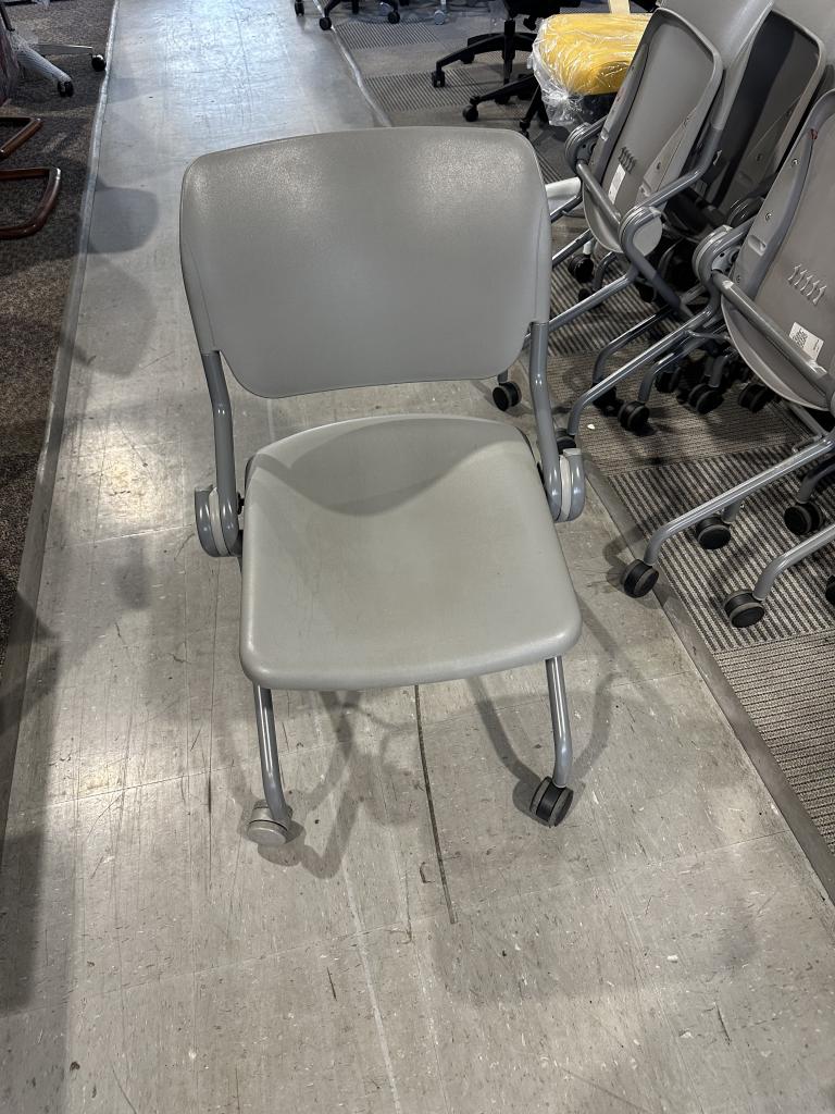 Description Nesting Chairs in Gray by KI On Casters 18" Seat D 16 1/2" Seat L 32" H used Chairs , w/ normal wear & tear, overall in good working condition (Minimum Order of 20 when shipping please)