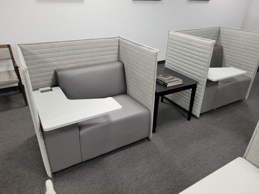 Description 45x36x43 gray fabric, tablet arm with privacy walls. USB and power built in. New list price is $5875.