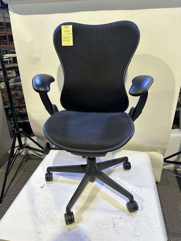 Description Herman Miller Mirra Office Chair Goes up and down Tilt control Tension control Adjustable back support Arms Adjustable Up/ Down and side to side Front Flex Seat Option 8 Matching Chairs Like This Used chair , comes w normal wear and tear but in overall good working condition ( check photos)