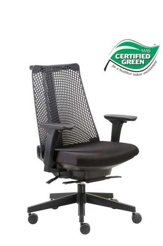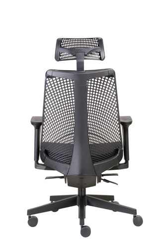 Description This contemporary mesh chair has a unique design with a frameless flexible molded mesh back and a molded foam seat upholstered with black crepe fabric. The chair features adjustable height arms, self-adjusting synchro-tilt mechanism, seat slider included, large 27” nylon base and large heavy duty caster. Available with an optional headrest.