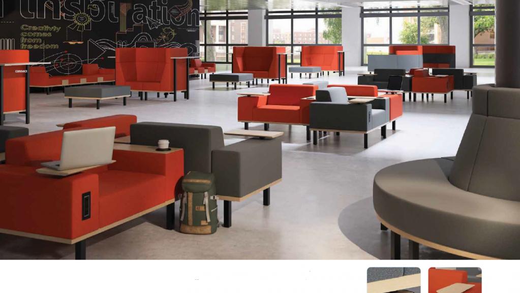 Description Modern Office Lounge Tablet Chairs & Booths Seek solitude in public locations! Two high-back corners form a booth that provides intimate seating with visual and audible separation for focused conversations. Tablet chairs feature a cup holder, power and a pivoting table that slides over your lap for a convenient worksurface and is flush with the chair arm when not in use. Perfect for wifi areas, educational, employee or public lounge areas.